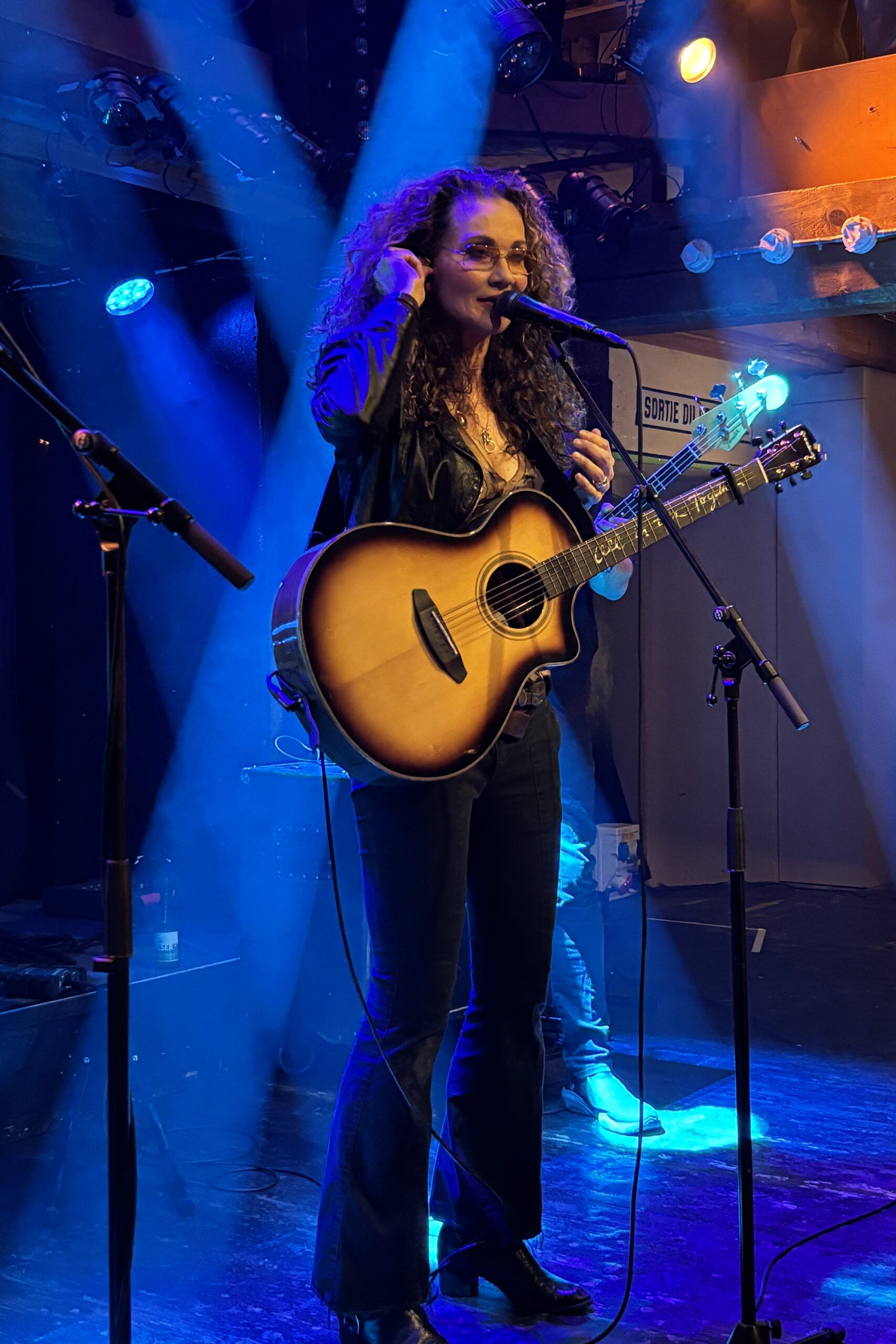 Dans la foulée de sa dernière galette live encore chaude (« Live In Denmark », Ruf Records) sortie en mars dernier et de son album studio « Borrowed Times » (Ruf Records, 2022), Dana Fuchs arrive sur scène décontractée et tout sourire. La proximité du public autour de la petite scène comme un patio, les différents étages garnis de fans appuyés aux balustrades et la décoration vintage sont autant d’ingrédients qui contribuent à créer l’ambiance unique de l’endroit où tout un chacun se sent chez soi.